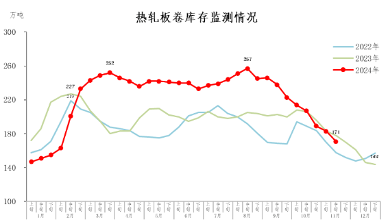 11月中旬,熱軋板卷庫(kù)存171萬(wàn)噸,環(huán)比減少12萬(wàn)噸,下降6.6%,庫(kù)存降幅擴(kuò)大;比年初增加27萬(wàn)噸,上升18.8%;比上年同期減少7萬(wàn)噸,下降3.9%。