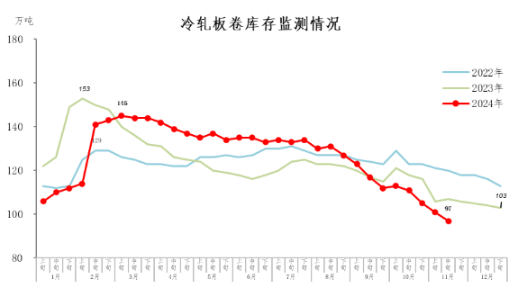 11月中旬,冷軋板卷庫(kù)存97萬(wàn)噸,環(huán)比減少4萬(wàn)噸,下降4.0%,庫(kù)存持續(xù)下降;比年初減少6萬(wàn)噸,下降5.8%;比上年同期減少10萬(wàn)噸,下降9.3%。