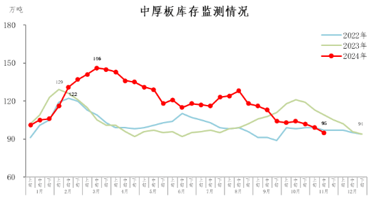 11月中旬,中厚板庫(kù)存95萬(wàn)噸,環(huán)比減少4萬(wàn)噸,下降4.0%,降幅略有擴(kuò)大;比年初增加1萬(wàn)噸,上升1.1%;比上年同期減少14萬(wàn)噸,下降12.8%。