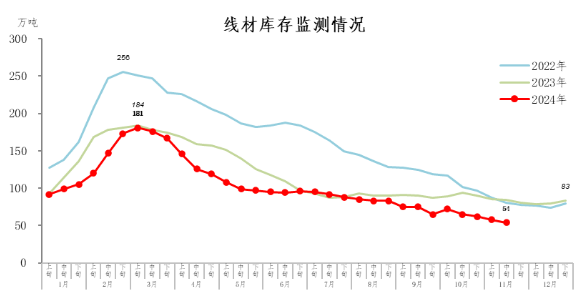 11月中旬,線材庫(kù)存54萬(wàn)噸,環(huán)比減少4萬(wàn)噸,下降6.9%,庫(kù)存繼續(xù)下降;比年初減少29萬(wàn)噸,下降34.9%;比上年同期減少30萬(wàn)噸,下降35.7%。