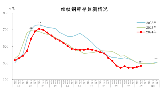 11月中旬,螺紋鋼庫(kù)存267萬(wàn)噸,環(huán)比增加15萬(wàn)噸,上升6.0%,庫(kù)存連續(xù)上升;比年初減少38萬(wàn)噸,下降12.5%;比上年同期減少28萬(wàn)噸,下降9.5%。