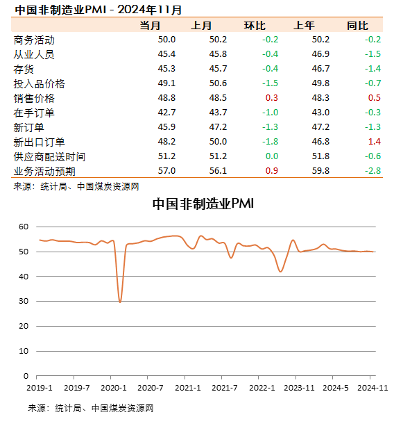 11月份,非制造業(yè)商務(wù)活動指數(shù)為50.0%,比上月下降0.2個百分點,位于臨界點。