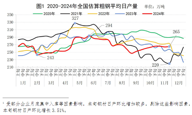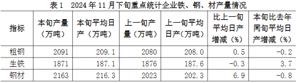 2024年11月下旬,重點(diǎn)統(tǒng)計(jì)鋼鐵企業(yè)共生產(chǎn)粗鋼2091萬噸,平均日產(chǎn)209.1萬噸,日產(chǎn)環(huán)比增長0.5%;生鐵1871萬噸,平均日產(chǎn)187.1萬噸,日產(chǎn)環(huán)比下降0.3%;鋼材2163萬噸,平均日產(chǎn)216.3萬噸,日產(chǎn)環(huán)比增長6.9%1(見表1)。