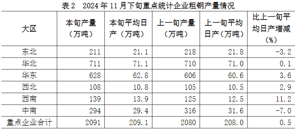 11月下旬六大地區(qū)中,除東北、中南地區(qū)重點(diǎn)統(tǒng)計(jì)企業(yè)粗鋼日產(chǎn)量較上一旬下降外,其它地區(qū)均有所增長(詳見表2),具體為: