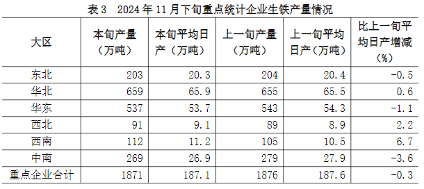 11月下旬六大地區(qū)中,東北、華東、中南地區(qū)重點(diǎn)統(tǒng)計(jì)企業(yè)生鐵日產(chǎn)量較上一旬有所下降,其它地區(qū)均有所增長(詳見表3),具體為: