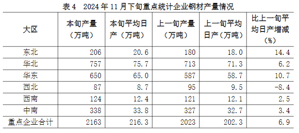 11月下旬六大地區(qū)中,除西北地區(qū)重點(diǎn)統(tǒng)計(jì)企業(yè)鋼材日產(chǎn)量較上一旬有所下降外,其它地區(qū)均有不同程度增長(詳見表4),具體為: