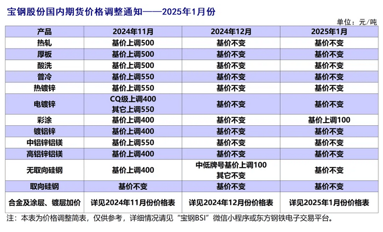 經(jīng)研究決定,寶鋼股份板材內(nèi)銷價格2025年1月份在2024年12月份基礎(chǔ)上調(diào)整公告如下(以下除特殊注明外,均為不含稅):