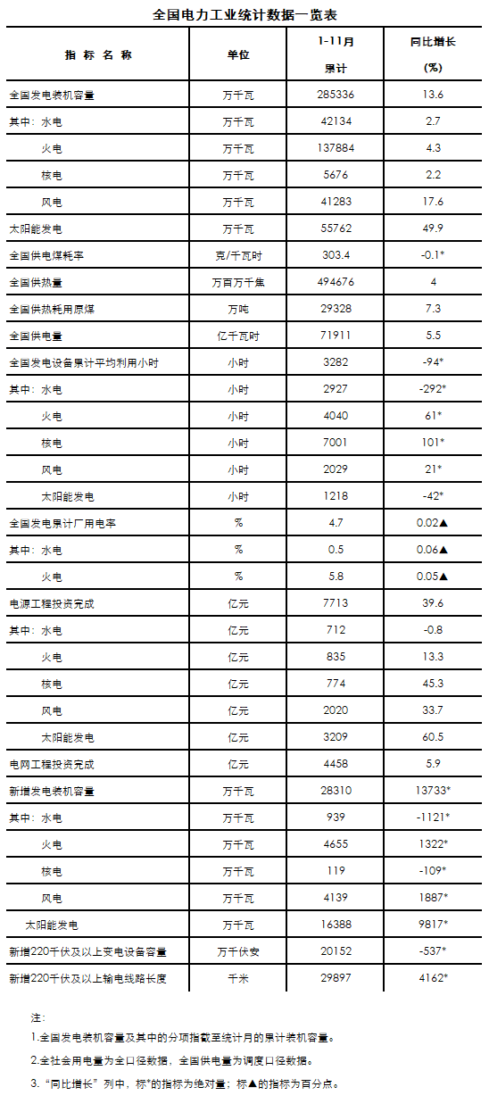 12月20日,國家能源局發(fā)布1-11月份全國電力工業(yè)統(tǒng)計數據。