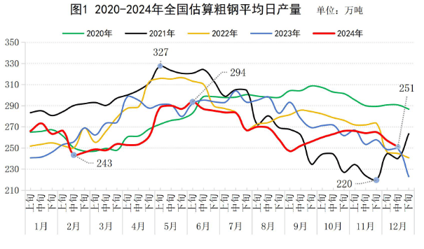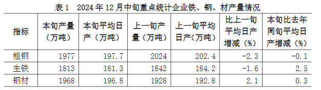 2024年12月中旬,重點(diǎn)統(tǒng)計(jì)鋼鐵企業(yè)共生產(chǎn)粗鋼1977萬噸,平均日產(chǎn)197.7萬噸,日產(chǎn)環(huán)比下降2.3%;生鐵1813萬噸,平均日產(chǎn)181.3萬噸,日產(chǎn)環(huán)比下降1.6%;鋼材1968萬噸,平均日產(chǎn)196.8萬噸,日產(chǎn)環(huán)比增長2.1%(見表1)。