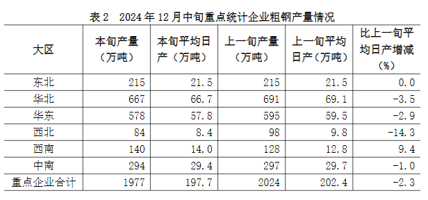 12月中旬六大地區(qū)中,除西南地區(qū)重點(diǎn)統(tǒng)計(jì)企業(yè)粗鋼日產(chǎn)量較上一旬增長、東北地區(qū)粗鋼日產(chǎn)量較上一旬基本持平外,其它地區(qū)均有不同程度下降(詳見表2),具體為: