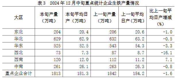 12月中旬六大地區(qū)中,除西南地區(qū)重點(diǎn)統(tǒng)計(jì)企業(yè)生鐵日產(chǎn)量較上一旬有所增長外,其它地區(qū)均有不同程度下降(詳見表3),具體為: