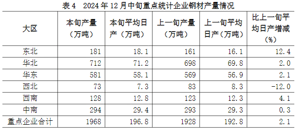 12月中旬六大地區(qū)中,除西北地區(qū)重點(diǎn)統(tǒng)計(jì)企業(yè)鋼材日產(chǎn)量較上一旬下降外,其它地區(qū)均有不同程度增長(詳見表4),具體為: