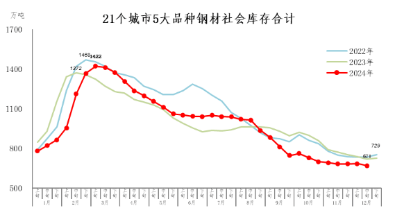 12月中旬,21個(gè)城市5大品種鋼材社會庫存671萬噸,環(huán)比減少14萬噸,下降2.0%,庫存再次探底;比年初減少58萬噸,下降8.0%;比上年同期減少48萬噸,下降6.7%。
