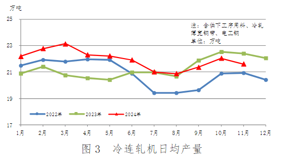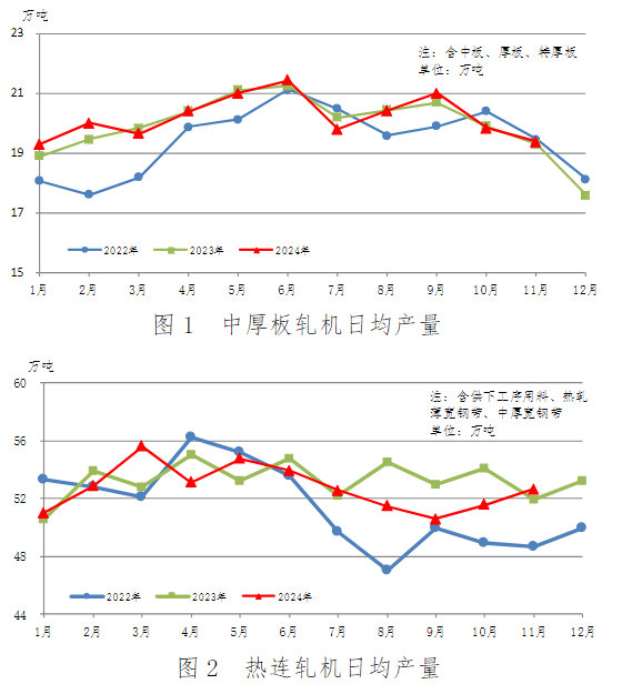 中厚板軋機、熱連軋機、冷連軋機日均產量變化見圖1、圖2、圖3。
