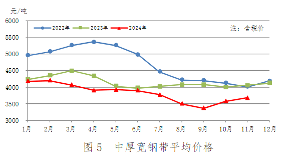11月份,中厚寬鋼帶產量675萬噸,同比增加10萬噸,上升1.5%;銷售668萬噸,其中出口51萬噸,產銷率99.0%;售價3674元/噸,比上月上漲98元/噸。累計產量7374萬噸,同比減少349萬噸,下降4.5%。中厚寬鋼帶平均價格見圖5。