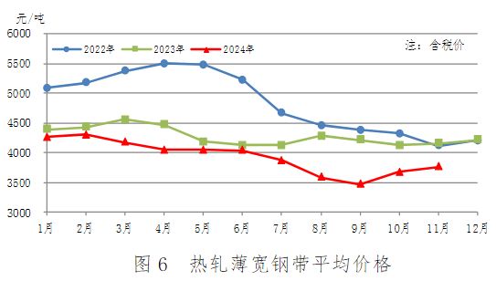 11月份,熱軋薄寬鋼帶產量240萬噸,同比增加15萬噸,上升6.8%;銷售261萬噸,其中出口22萬噸,產銷率108.8%;售價3764元/噸,比上月上漲95元/噸。累計產量2679萬噸,同比增加198萬噸,上升8.0%。熱軋薄寬鋼帶均價見圖6。