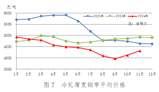 11月份,冷軋薄寬鋼帶產量327萬噸,同比減少39萬噸,下降10.6%;銷售319萬噸,其中出口18萬噸,產銷率97.6%;售價4311元/噸,比上月上漲193元/噸。累計產量3770萬噸,同比增加67萬噸,上升1.8%。冷軋薄寬鋼帶平均價格見圖7。