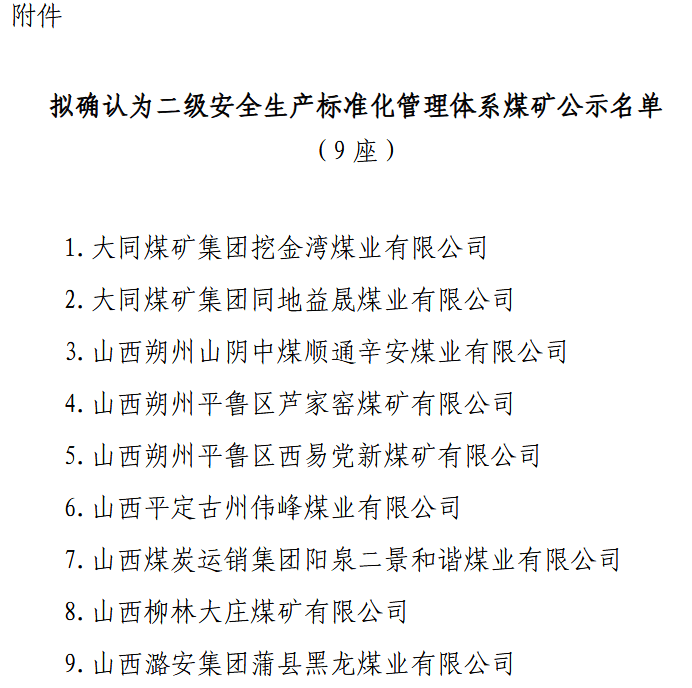 擬確認二級安全生產(chǎn)標準化管理體系煤礦的公示