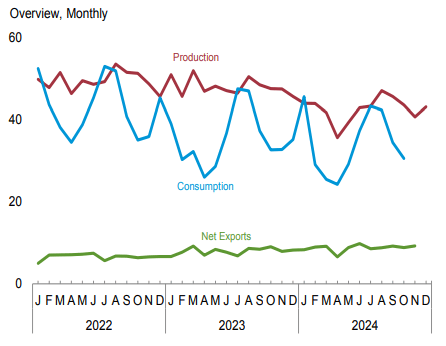 消費(fèi)方面,報告顯示,2024年10月份,美國煤炭總消費(fèi)量為3063.6萬短噸,同比下降6.39%,環(huán)比下降11.29%。